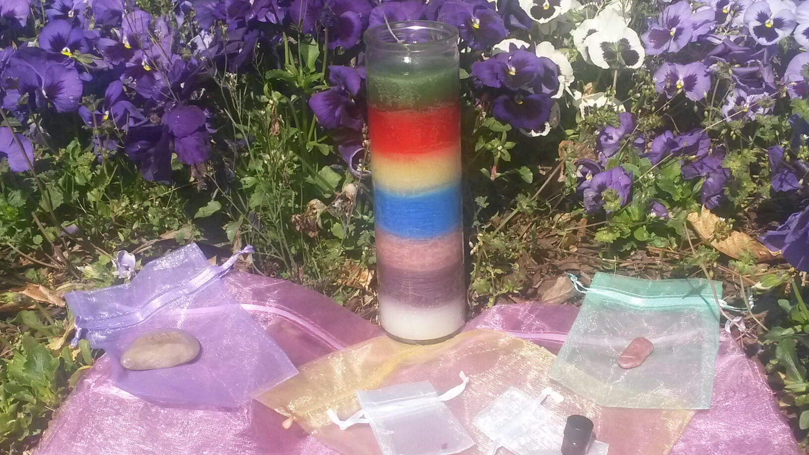 PACKAGE ONE ($40.00) This package includes a 4" candle *any color* (encased in glass), essential oil, birth stone, word stone and the final stone with the properties to bring to you or repel something away from you.